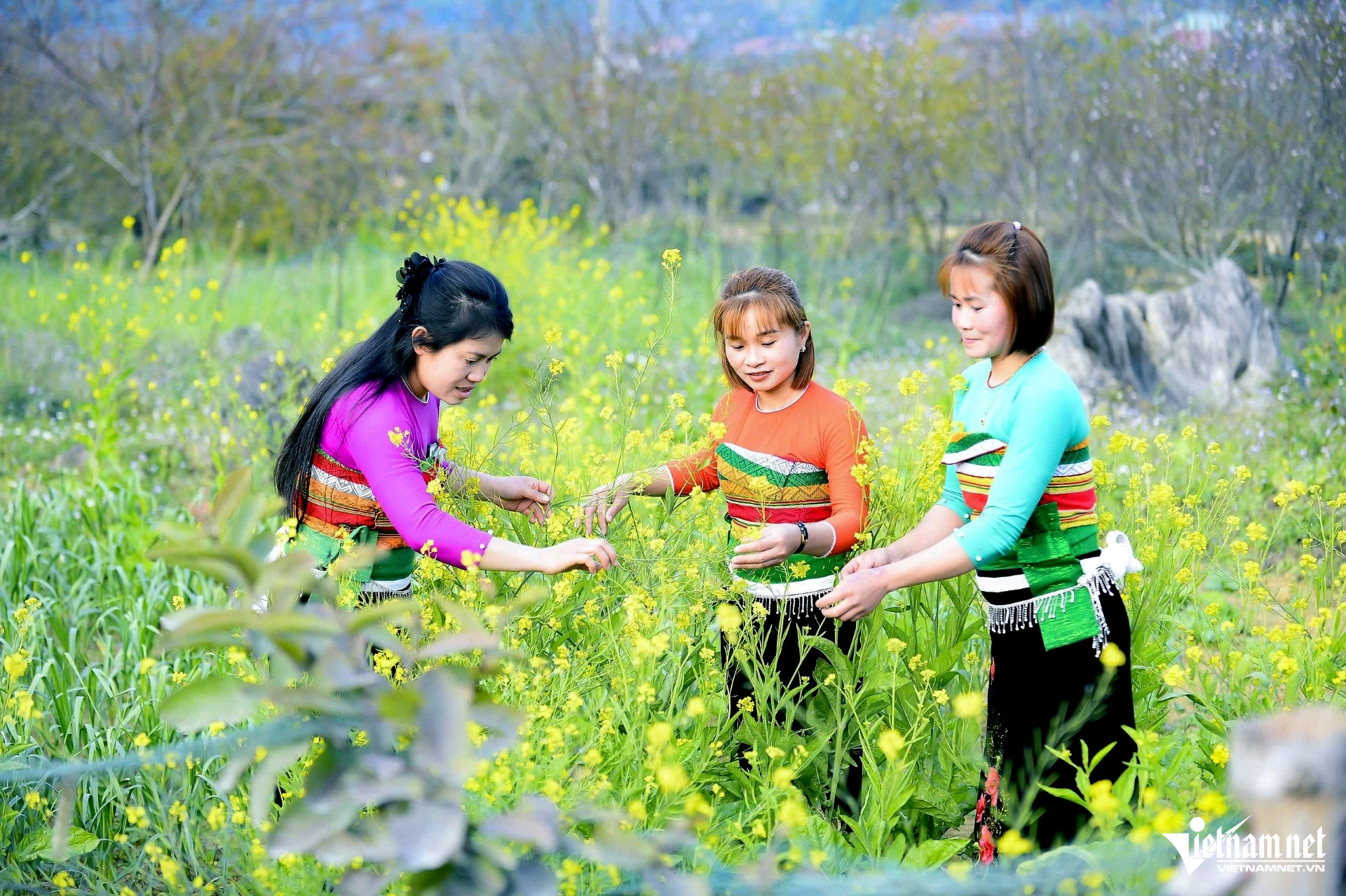 Không chỉ có đào và mận, những luống hoa cải được người dân gieo trồng dọc lối đi, ven nương rẫy cũng đang vào độ nở rộ. Sắc vàng hoa cải trải dài thành từng thảm nhỏ, góp phần làm rực rỡ thêm không gian núi rừng Cổ Lũng.