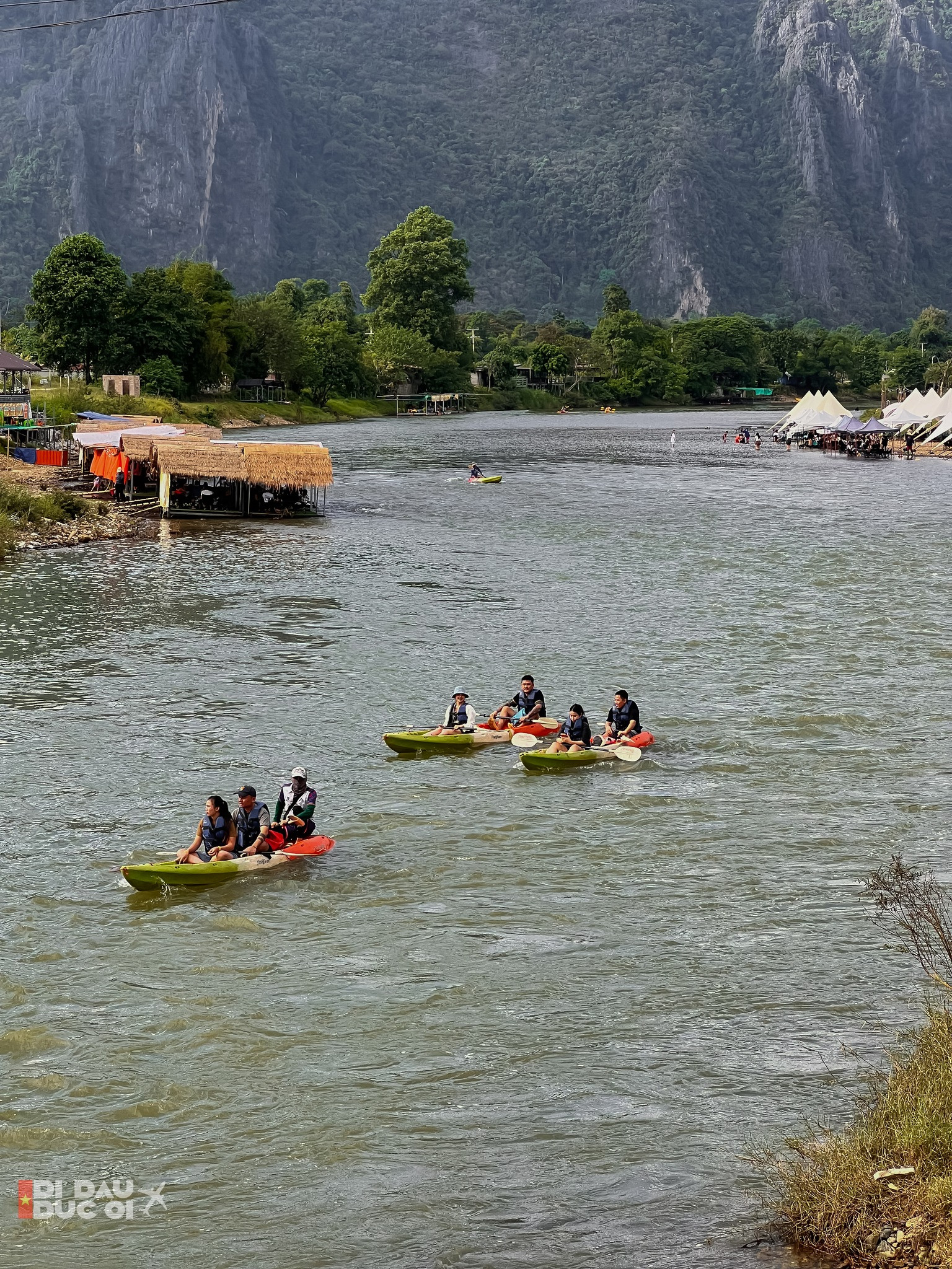 Du khách chèo thuyền trên sông ở Vang Vieng